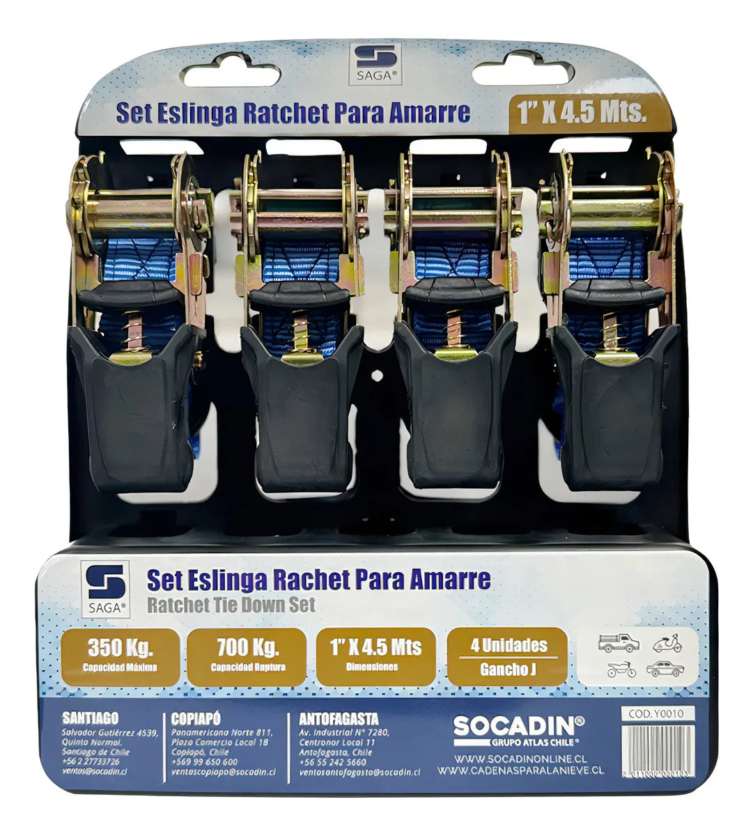 - 4 piezas con trinquete metálico. - Correas poliéster de alta resistencia. - Ganchos con recubrimiento anticorrosión. |
