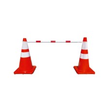 Barrera con conos y cintas rojo/blanco para control de acceso temporal. Ideal para obras, eventos y señalización de zonas restringidas.